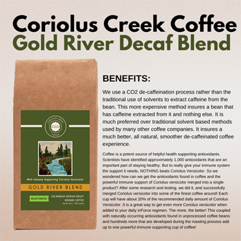 • Coriolus Creek Coffee Gold River Blend Decaffeinated with Immune Supporting Coriolus Versicolor